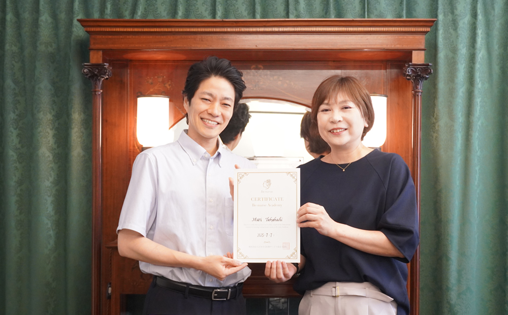 ヴィーナスアカデミーに参加され、仕事を続けながら、オンライン講座や横浜・銀座での研修会に通い、約1年間にわたり、美容医療・アンチエイジング・インナーケア・再生医療といった専門領域を体系的に学び、技術と知識を磨きました。