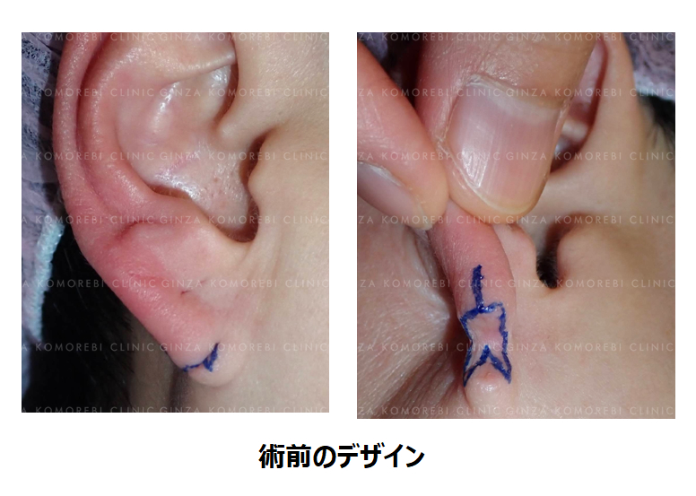 術後の耳垂の曲線を滑らかにするために、三角弁(局所皮弁)を選択しました。