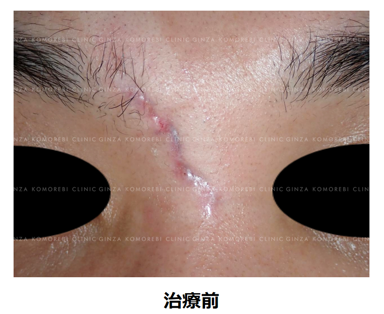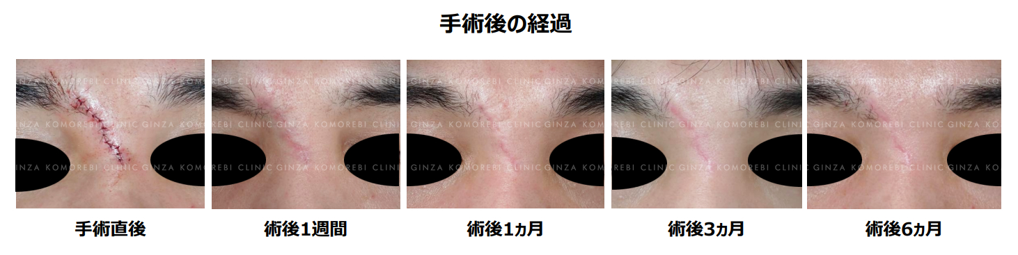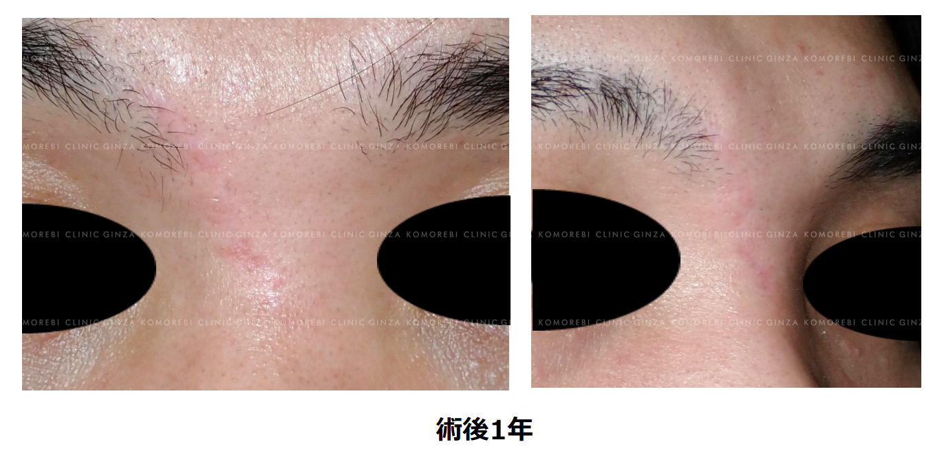 術前に認められた皮膚の凹凸や皮下異物、眉毛部の脱毛は改善し、傷の幅も狭くなっています。