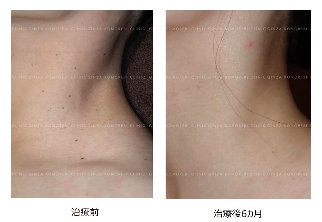 本症例では、長年にわたり少しずつ増えてきた首のスキンタッグを、1回の治療ですべて除去いたしました。