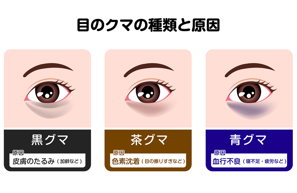 クマとは目の下にできる影やクスミです。クマは原因や状態によって、「黒クマ」「茶クマ」「青クマ」の3種類に分けられます。