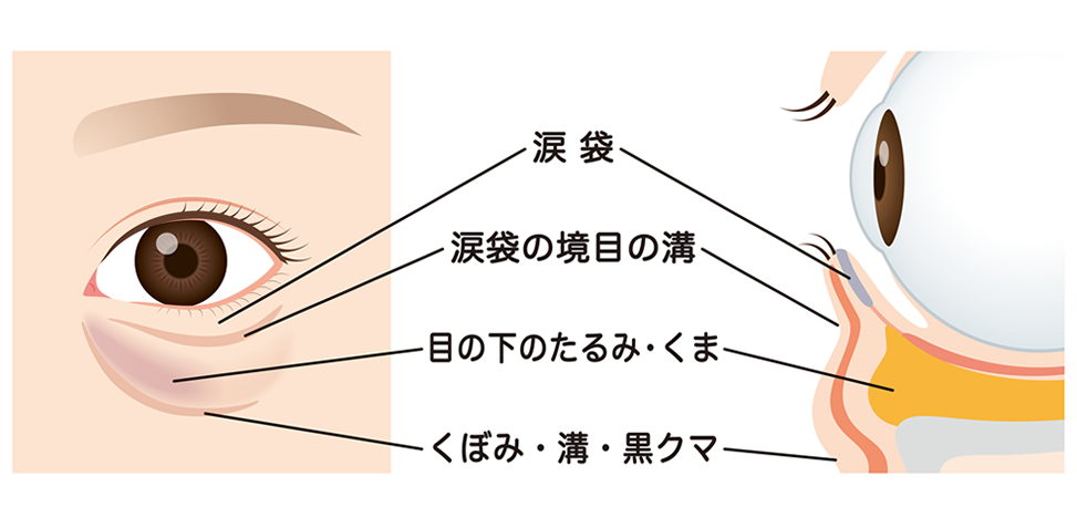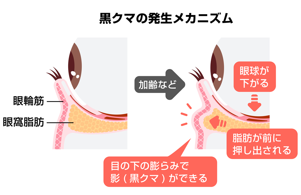 | 3大原因 | 1.目の下の眼窩脂肪の前方突出。 2.皮膚・眼輪筋のたるみ。 3.皮膚の段差による凹み |