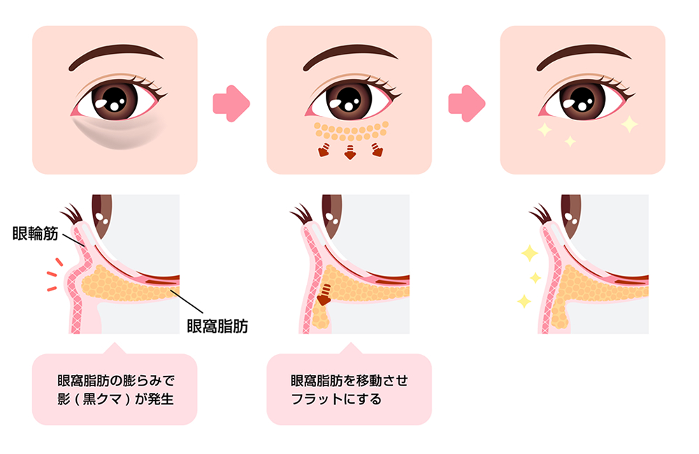 目の下の膨らみの原因は、脂肪の突出です。この手術では、目の下にある脂肪を取り除くのではなく、脂肪を移動させて再配置します。これにより、目元のたるみや膨らみを改善し、自然な仕上がりを実現します。