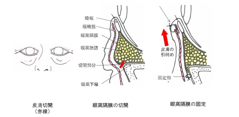 | 当院の治療方針 | 1.眼窩脂肪の前方突出を改善する。 2.皮膚のたるみを改善する。 3.凹みを改善する。 |