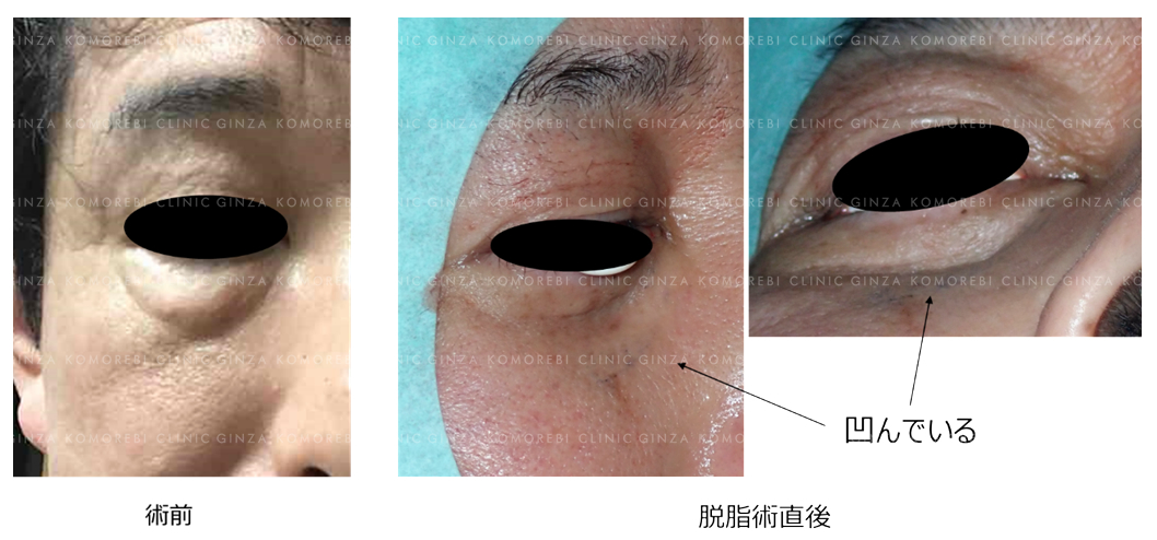 ただし、この術式は眼窩脂肪を除去するだけで、皮膚の切除や眼窩脂肪の移動は行いません。その為、凹みが目立たったり、皮膚が弛んだりして、逆に老けて見えることがありますので、適応の判断が大切です。