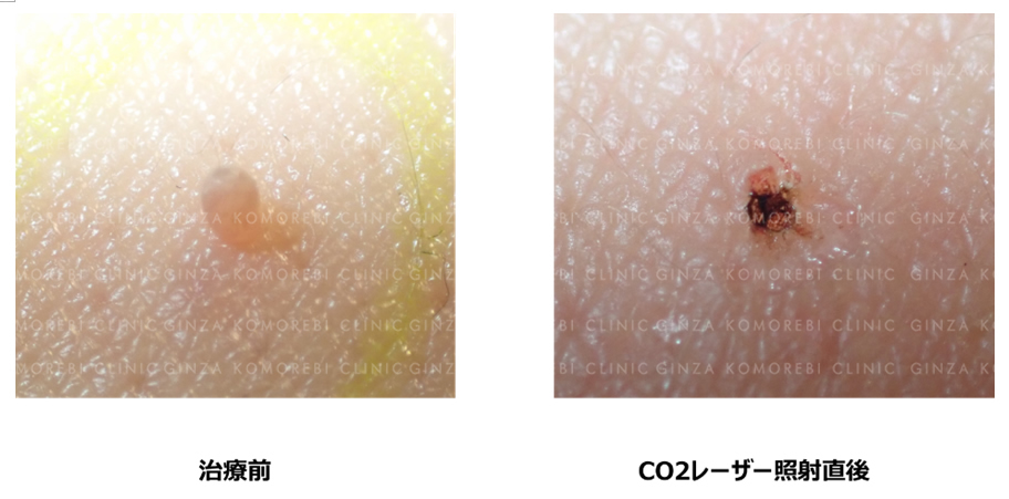 ただ、数十~数百個のスキンタッグを認める方も多いです。そのような場合は、表面麻酔を30分程度行って、皮膚の鎮痛をしてから炭酸ガス(CO2)レーザーを照射します。照射直後は、赤いぷつぷつができて、数日で小さな黒い瘡蓋(かさぶた)になっていきます。