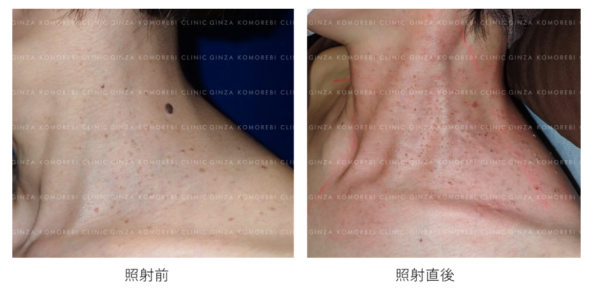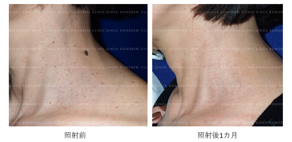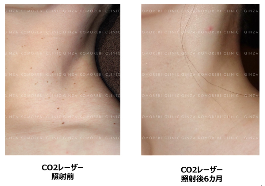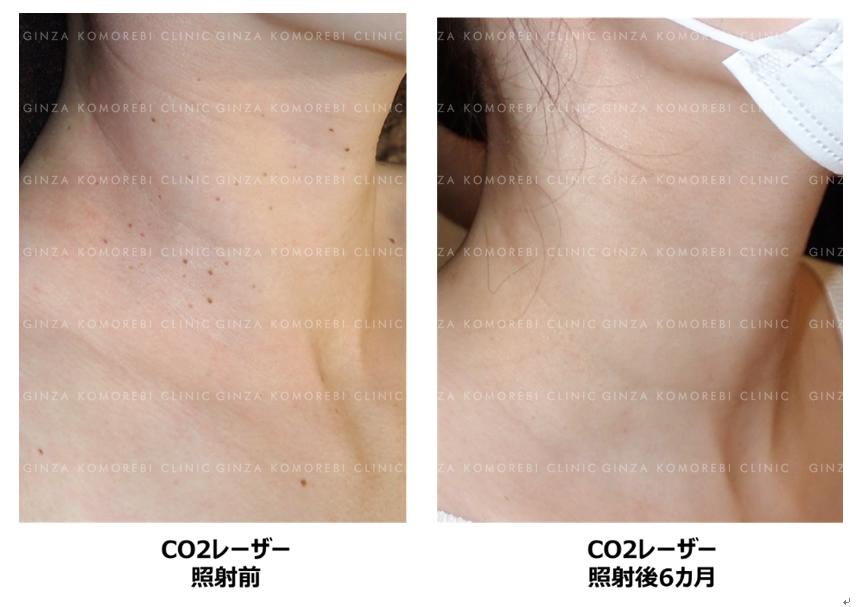 首は年齢がでる部分です。特に、首のスキンタッグは徐々に数が多くなり、サイズも大きくなり、色も目立ってきます。それらに対して、炭酸ガス(CO2)レーザーによる治療はとても有効で、患者さんの満足度が高い治療の1つです。