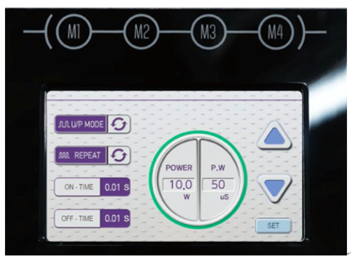 疾患の種類や状態、大きさ、部位により、適切な設置値(パラメーター)は変わります。NEW LESAC(ニューレザック)は出力を0.1W(ワット)設定することができて、されにパルス幅も最適値に変更できます。そのため、症例や患者様にあった出力設定が可能です。