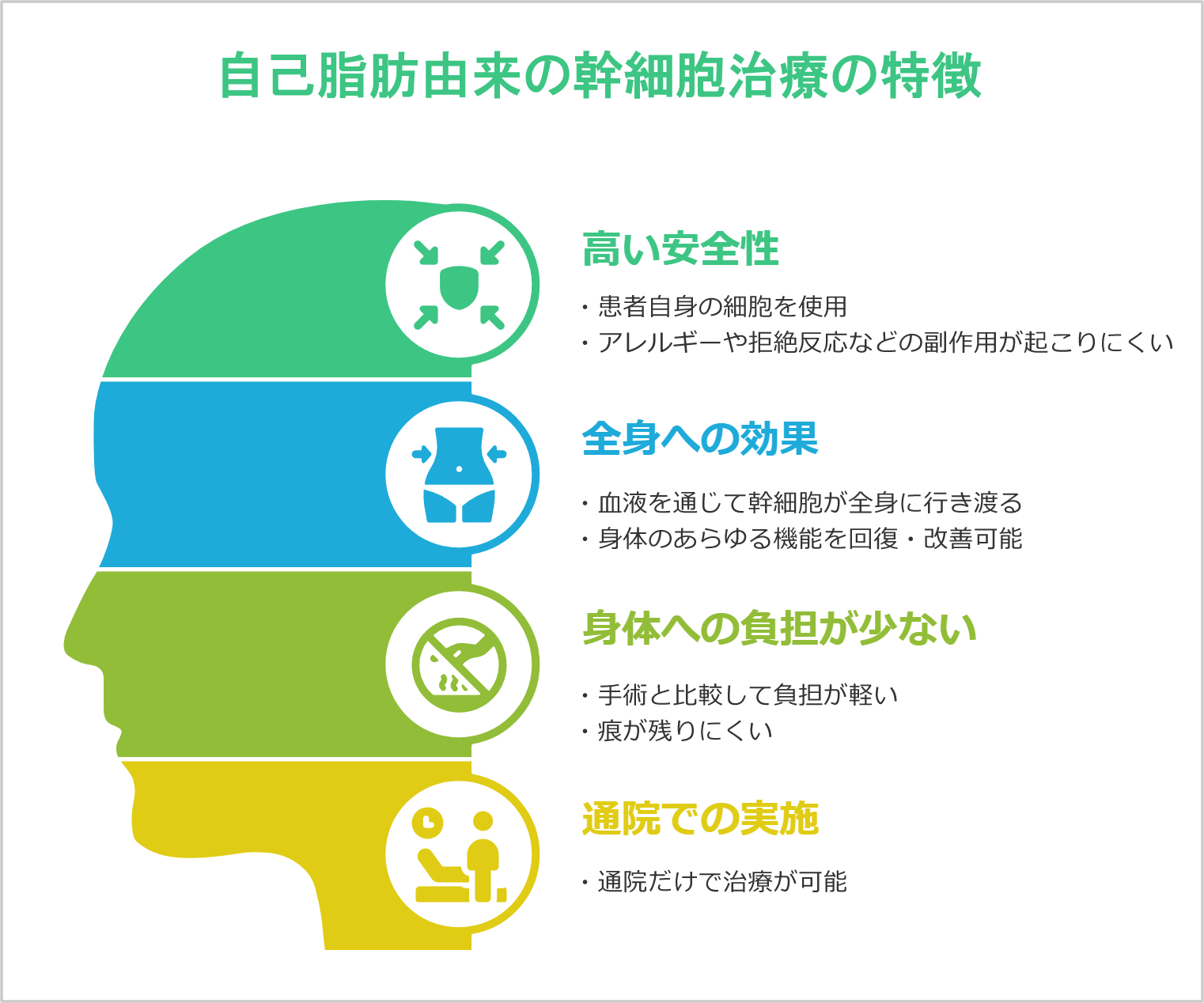 幹細胞治療にはいくつかの種類がありますが、その中でも「自己脂肪由来幹細胞治療」は、自分の脂肪から幹細胞を取り出して使う安全性の高い再生医療です。