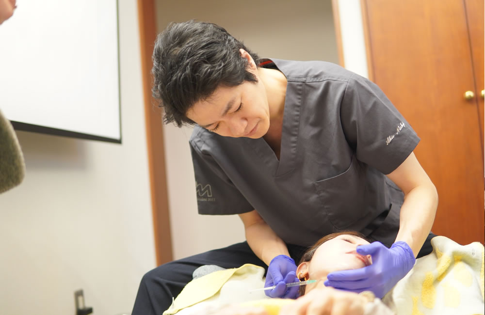 座学のあとは、短い休憩を挟み、銀座こもれびクリニック院長・西嶌暁生先生による実技研修を行いました。