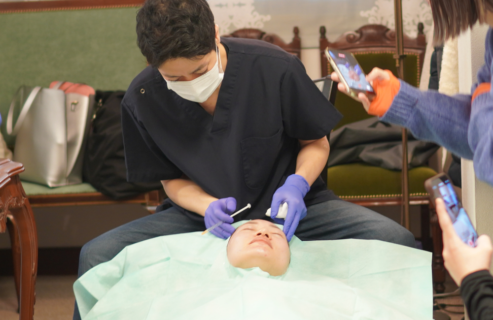続いて希望者を対象に、ボトックス・ヒアルロン酸の施術体験も行われ、技術習得に向けた理解が深まりました。