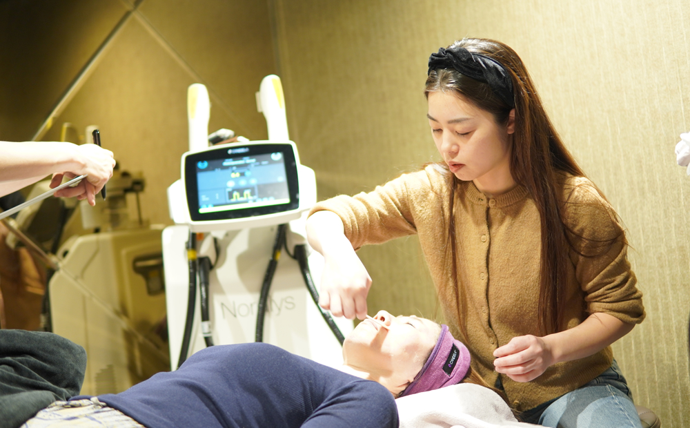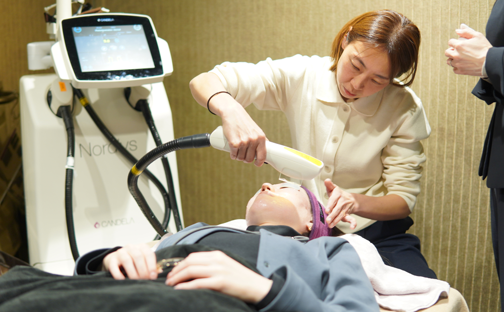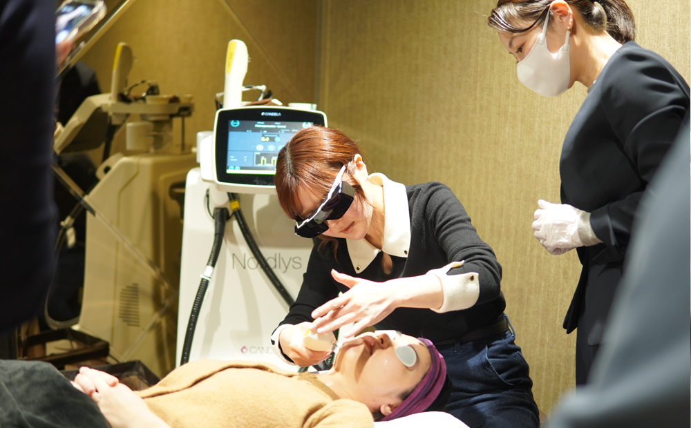 シネロン・キャンデラ株式会社の担当者によるレクチャーのもと、施術者役と被施術者役に分かれ、照射の流れや安全管理、患者様への声かけまでを一連のプロセスとして体験しました。