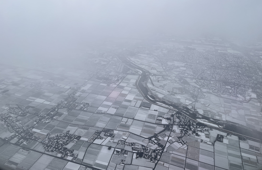 飛行機は約1時間遅れで福岡空港に到着しましたが、上空から見えた街並みは一面の銀世界でした。